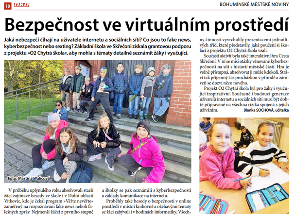 Náš celoroční projekt O2 Chytrá škola zaujal i místní média. Informace o něm vyšly v bohumínských městských novinách OKO a na webových stránkách města Bohumín.